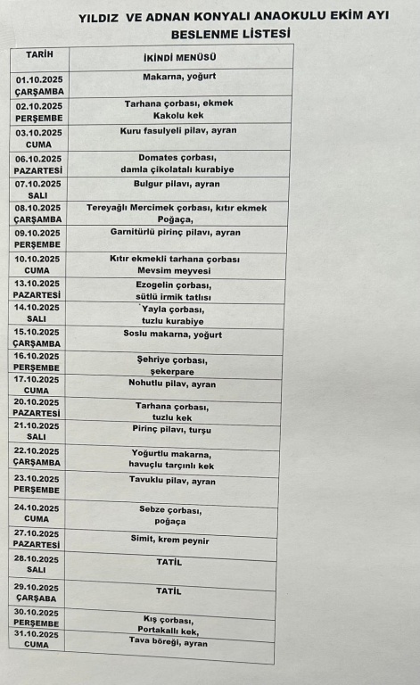 2025-2026 EĞİTİM ÖĞRETİM YILI EKİM AYI SABAHÇI GRUP KAHVALTI ...